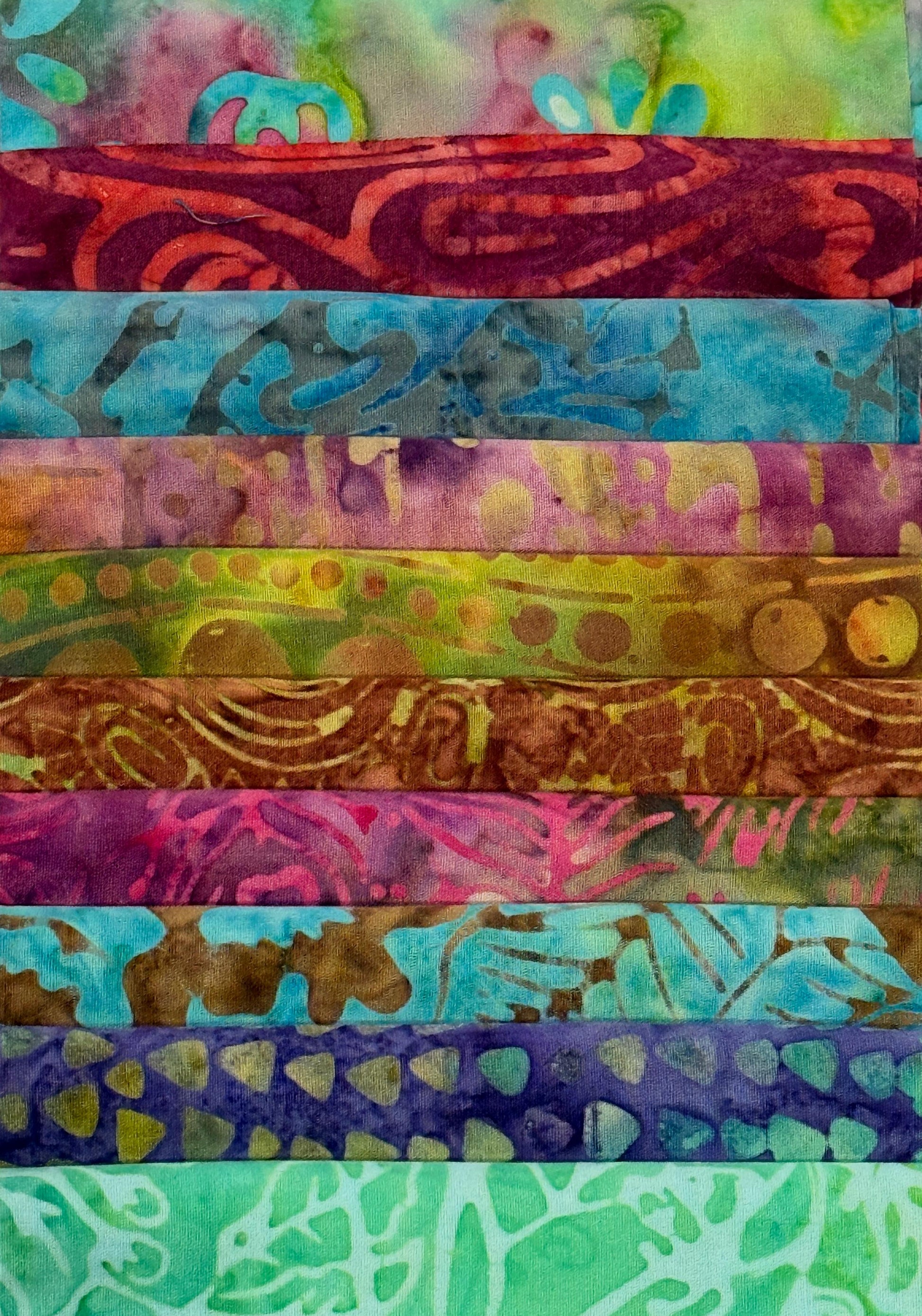 All Wacky Jacky's cotton and rayon batik are handstamped and handmade in a studio of Indonesian textile artisans. They won't fray under the needles, and your quilt will be machine washable (we've proven this!).