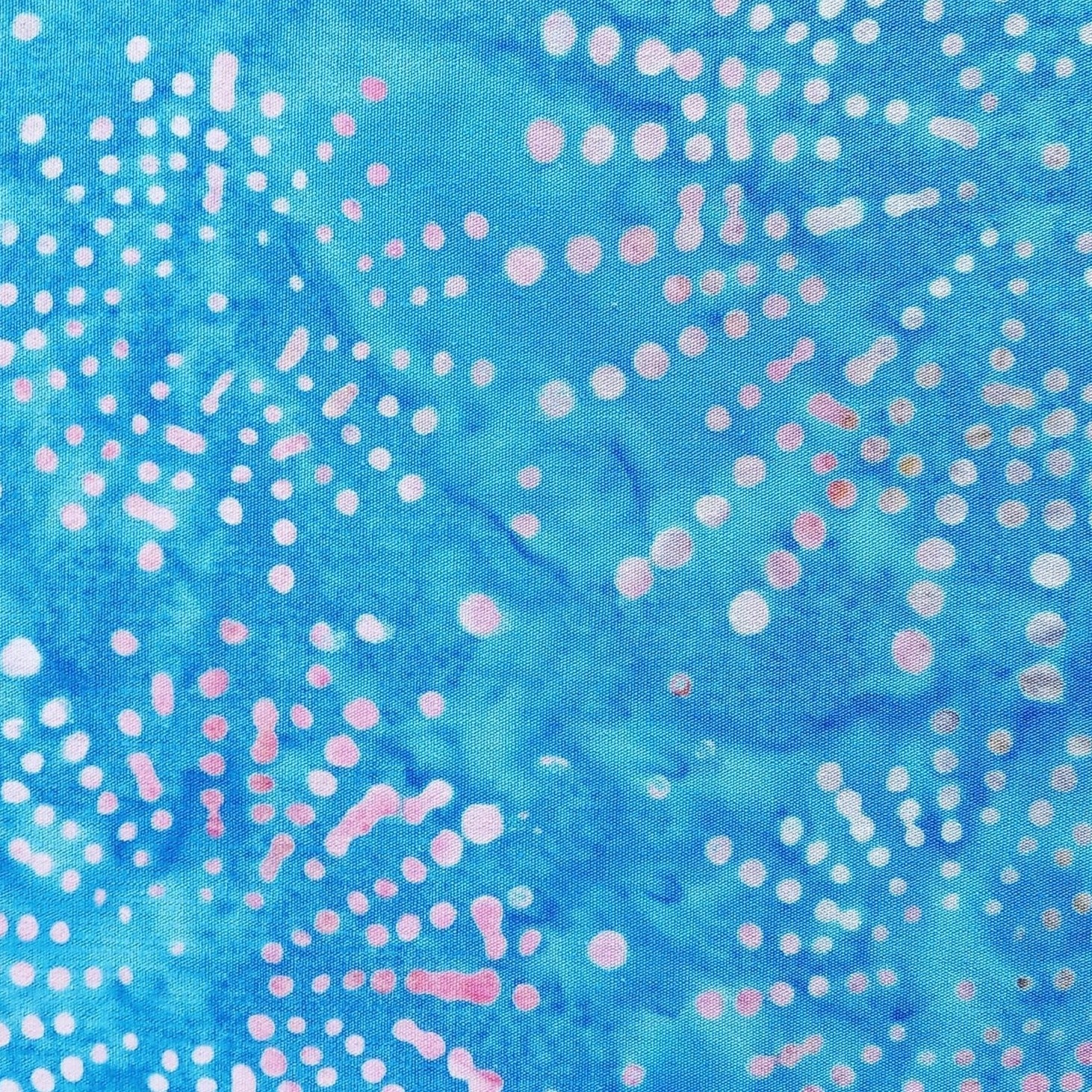 Oceanic Peach is a beautiful combination of cool blues and warm peach tones. The batik dyeing technique creates a unique pattern of droplets that appear like tiny bubbles in the ocean. This high-quality cotton fabric is perfect for quilting and other sewing projects.