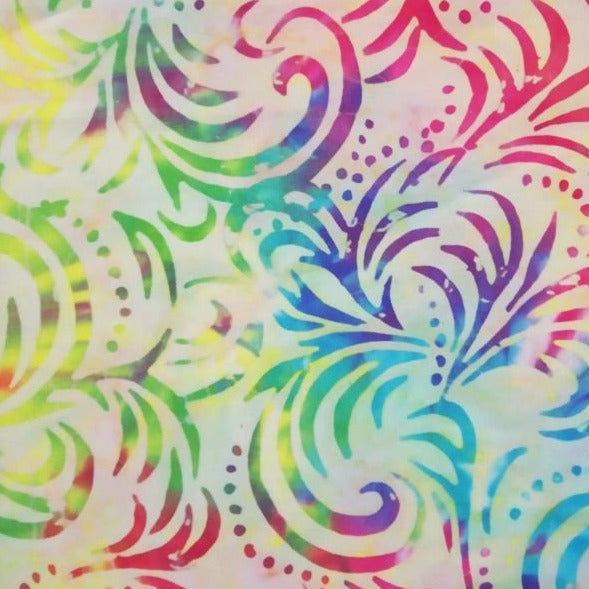 Plain white batik block brought to life by swirling rainbow leaf print, step outside of your comfort zone with this Scandalous batik block. Each order unit indicates one (1) bolt containing 10meters of fabric.