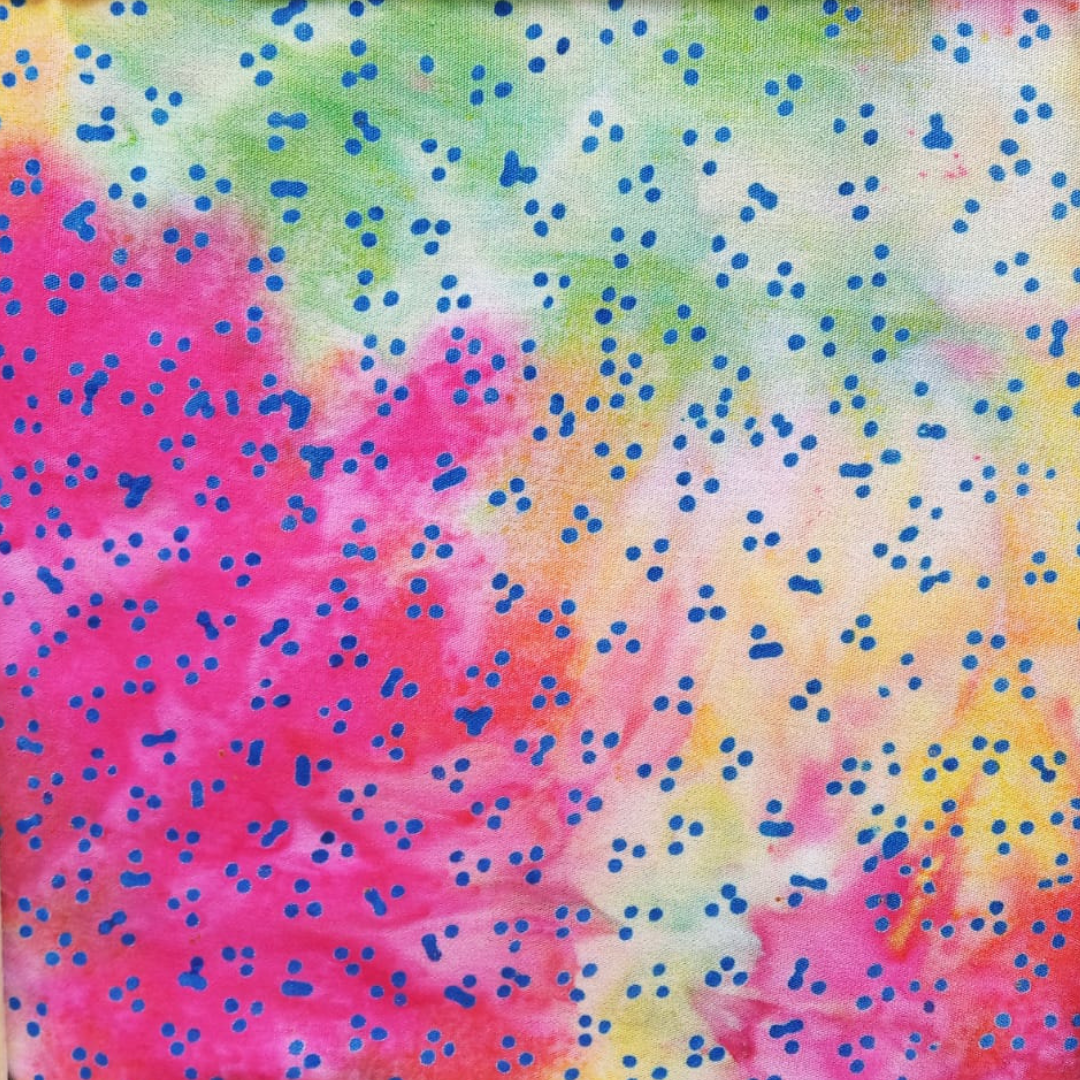 Bright pink, green, and yellow tie-dye paired with little blue dots. We guarantee you haven’t seen a design like this before! Each (1) unit order states the quantity of 0.25m, which means you'll need to add up the quantity to 4 to get 1m.